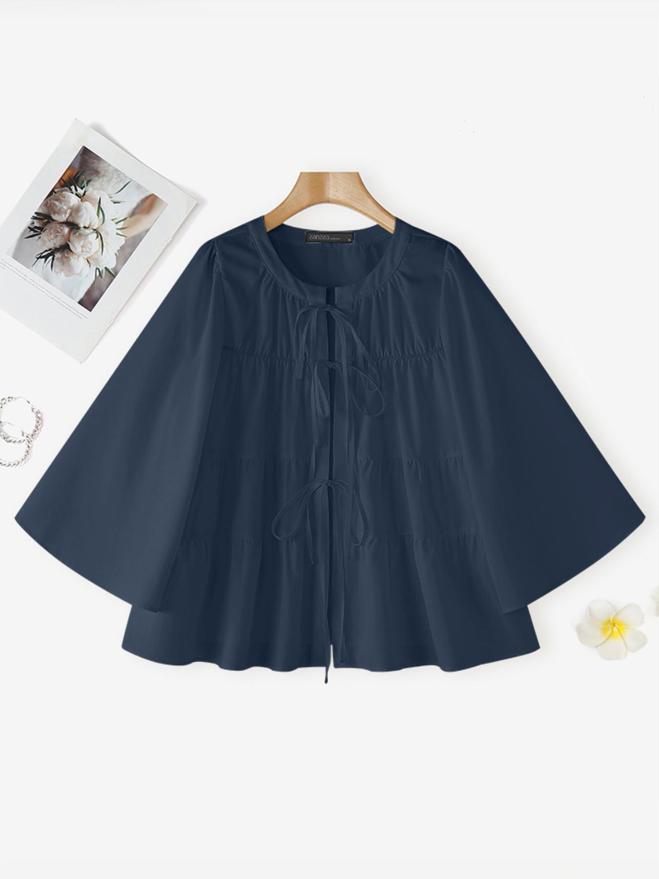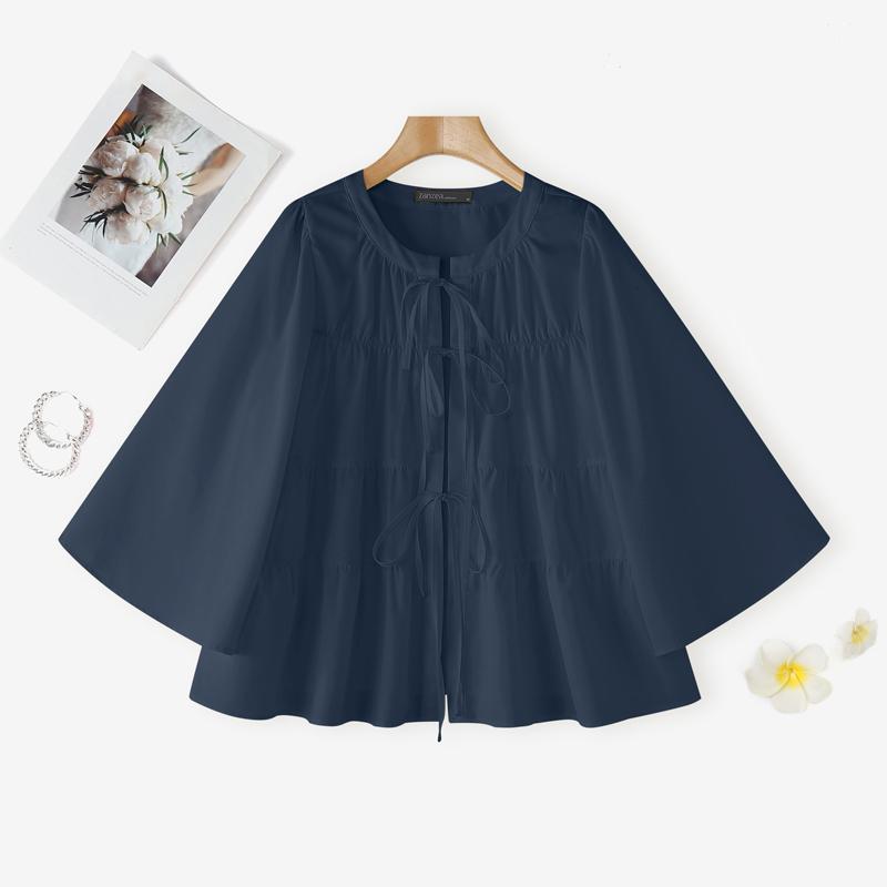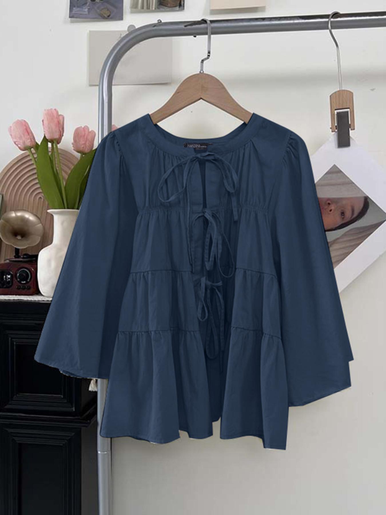 Plus Size - Casual Tops for Women in Plus Sizes Featuring a Solid Color, Long Sleeves, a Mandarin Collar, And a Tied Neck. This Loose, Lightweight Shirt Has a Tiered Design And Is Perfect for Everyday Wear, Embodying a Sweet And Cute Kor