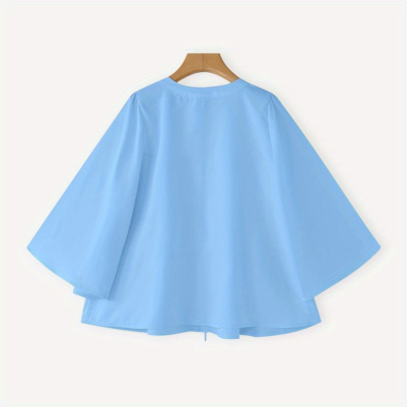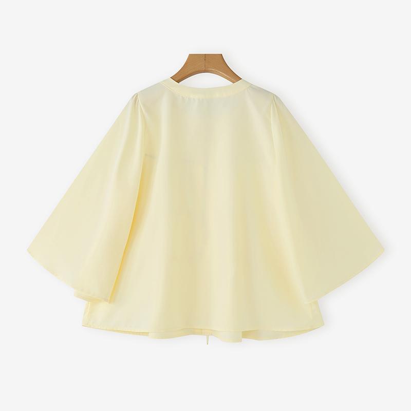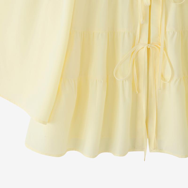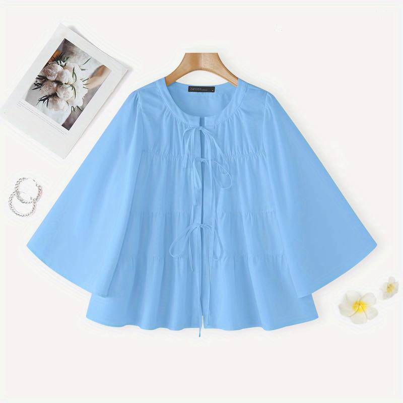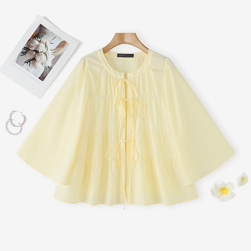 Plus Size - Casual Tops for Women in Plus Sizes Featuring a Solid Color, Long Sleeves, a Mandarin Collar, And a Tied Neck. This Loose, Lightweight Shirt Has a Tiered Design And Is Perfect for Everyday Wear, Embodying a Sweet And Cute Kor