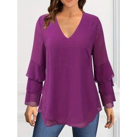 Plus Size, Women's Plus Size Elegant V-Neck Blouse - Chic Multi-Tiered Cake Sleeve Shirt, Flowy Formal & Everyday Tops for Parties, Dinners, Office - Machine Washable Women's Clothing, Party Attire, Rich Color Fabric