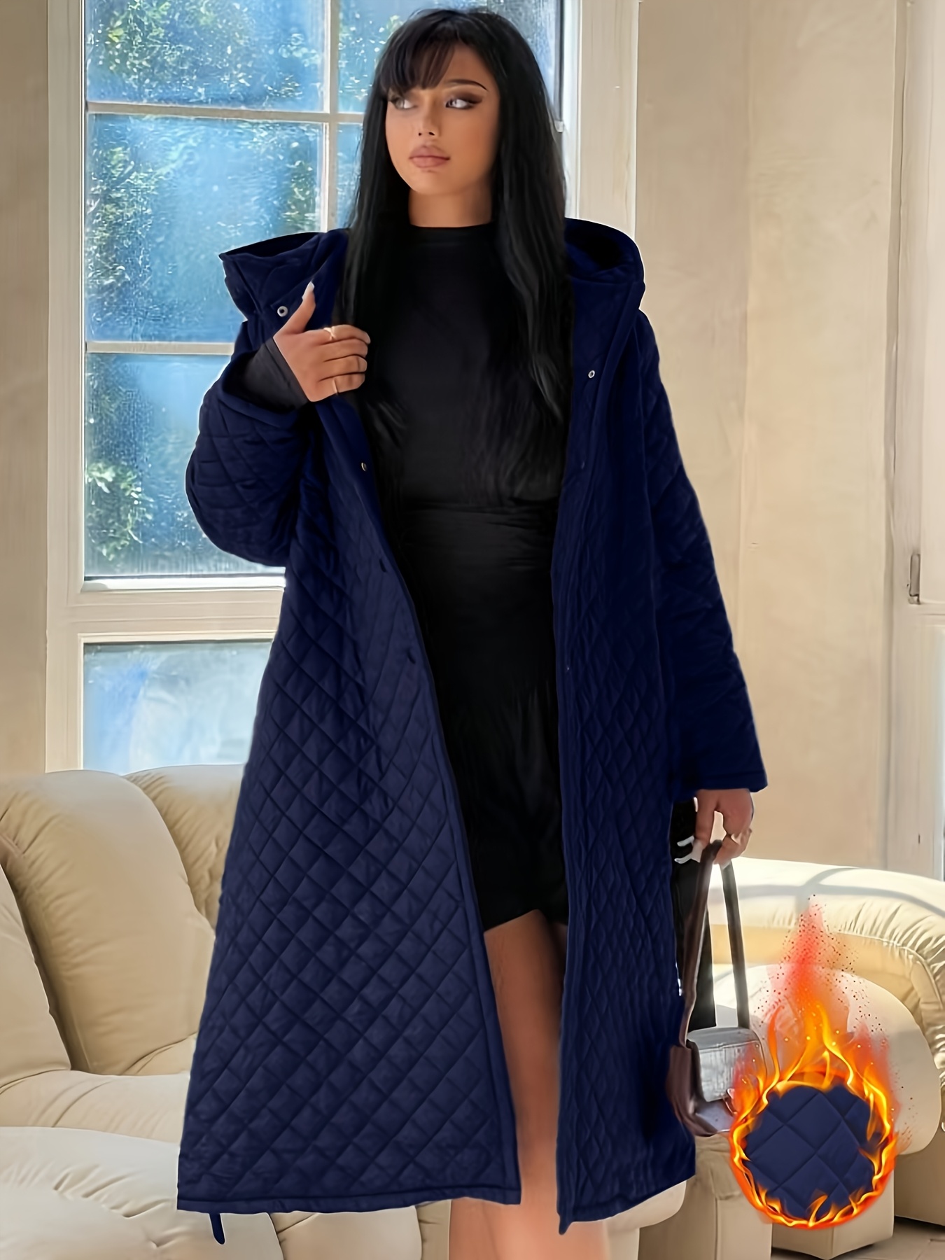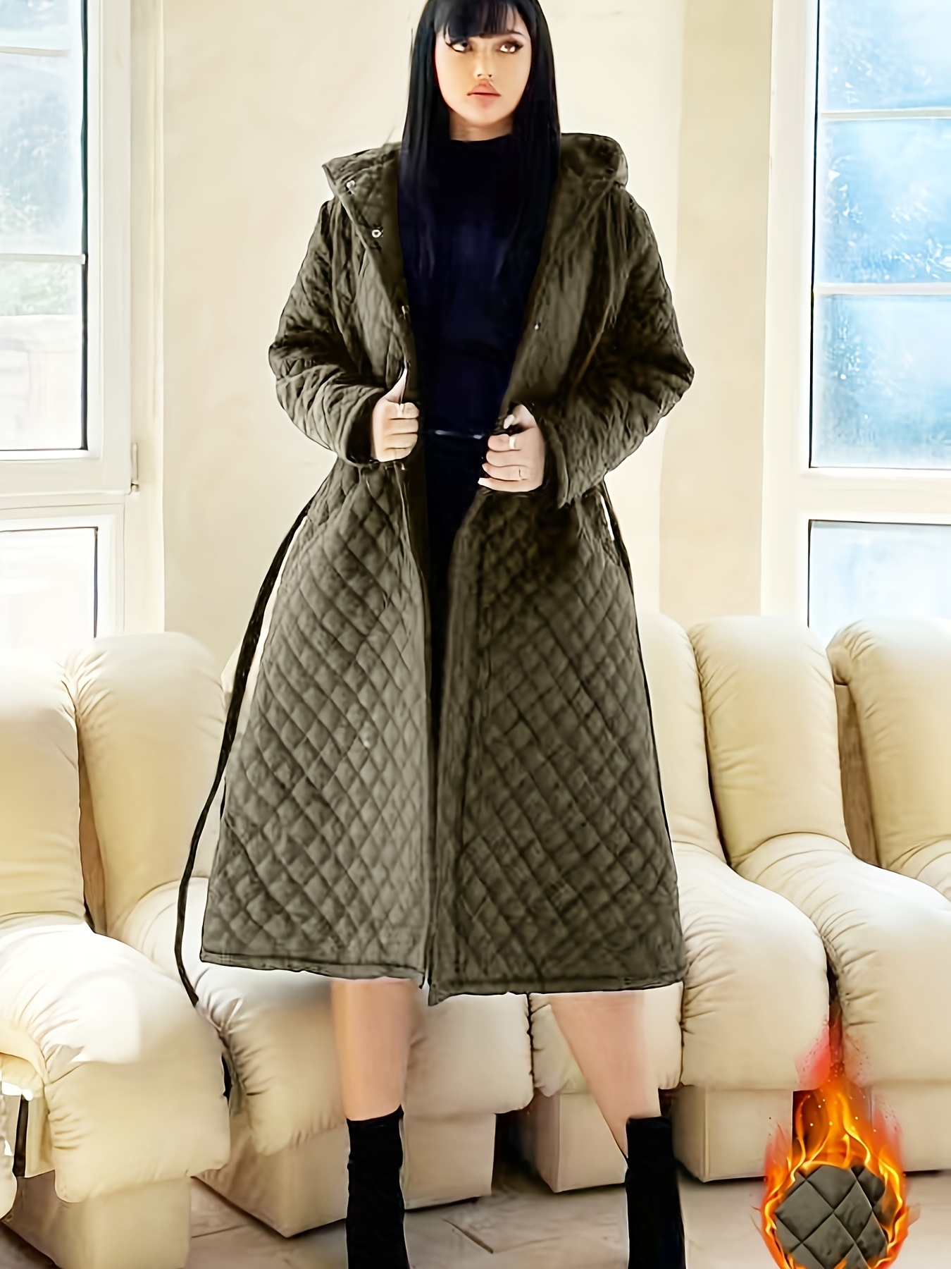 Plus Size - Elegant Fashion Quilted Over-the-Knee Dress with a Loose Hooded Design, Featuring a Belt for Women.