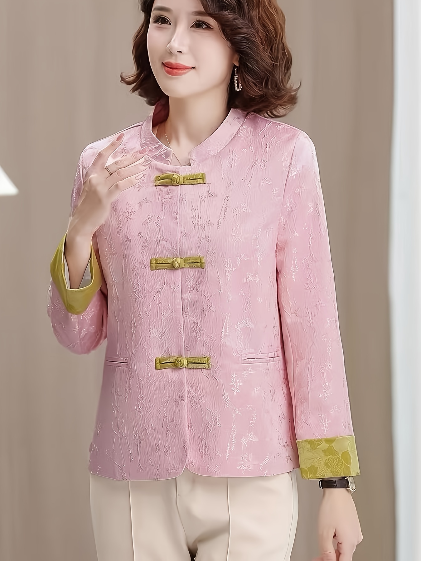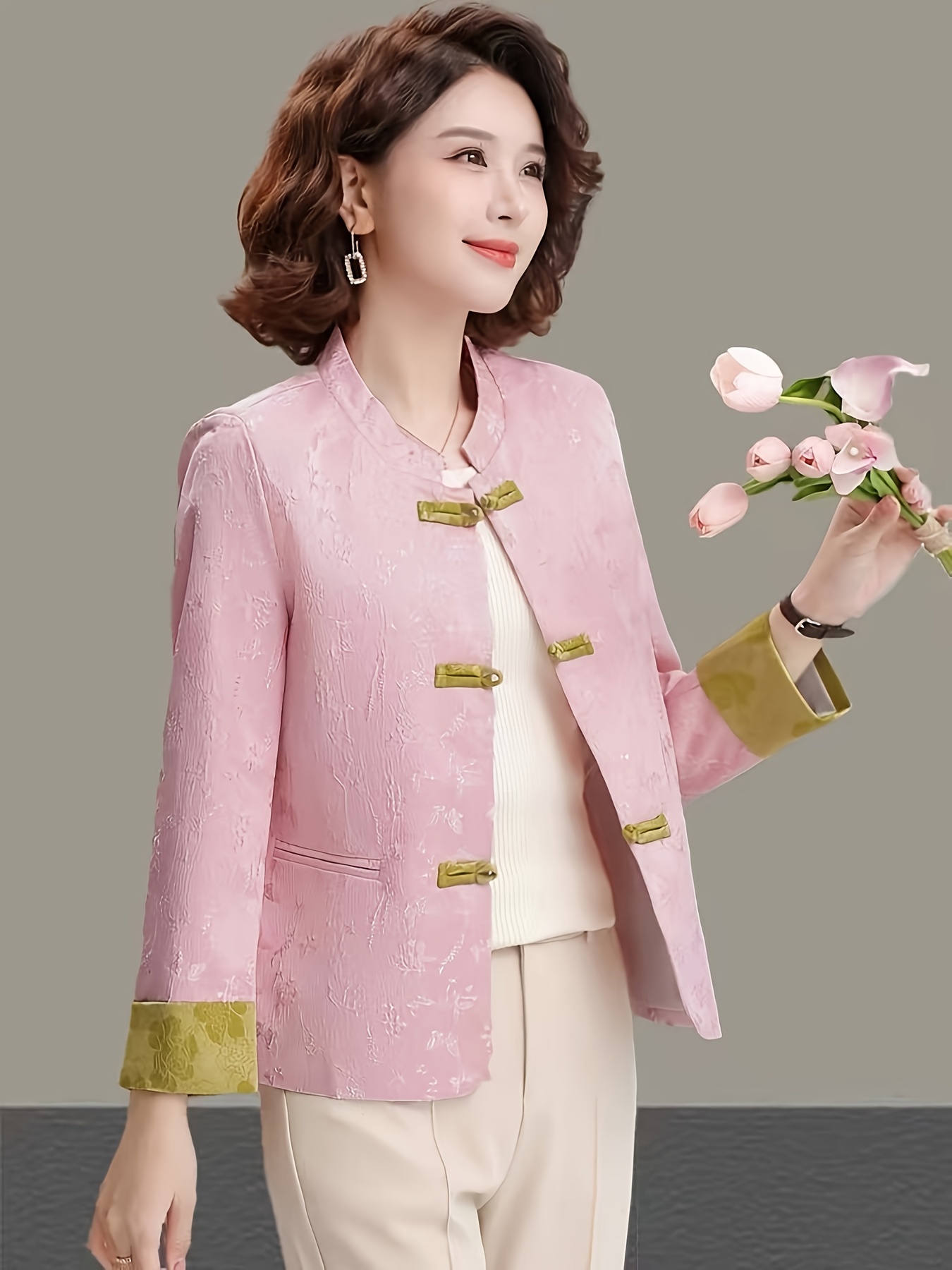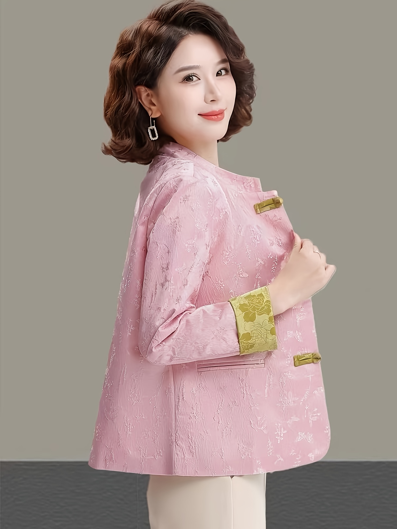 Plus Size - Plus Size, Women'S Chinese Cheongsam Coat - Elegant Vintage Tang Suit Jacket with Pastel pink & Golden Floral pattern, Non-Stretch Fabric, Button Front Closure, Traditional Cultural Formal & Everyday Chic Outerwear for Chinese New Year, Weddings, Cultural Events - Ready-to-Wear Women'S Clothing, Wedding Attire, Nontransparent Material, Festive Wear, Durable Construction, Plus Size Women