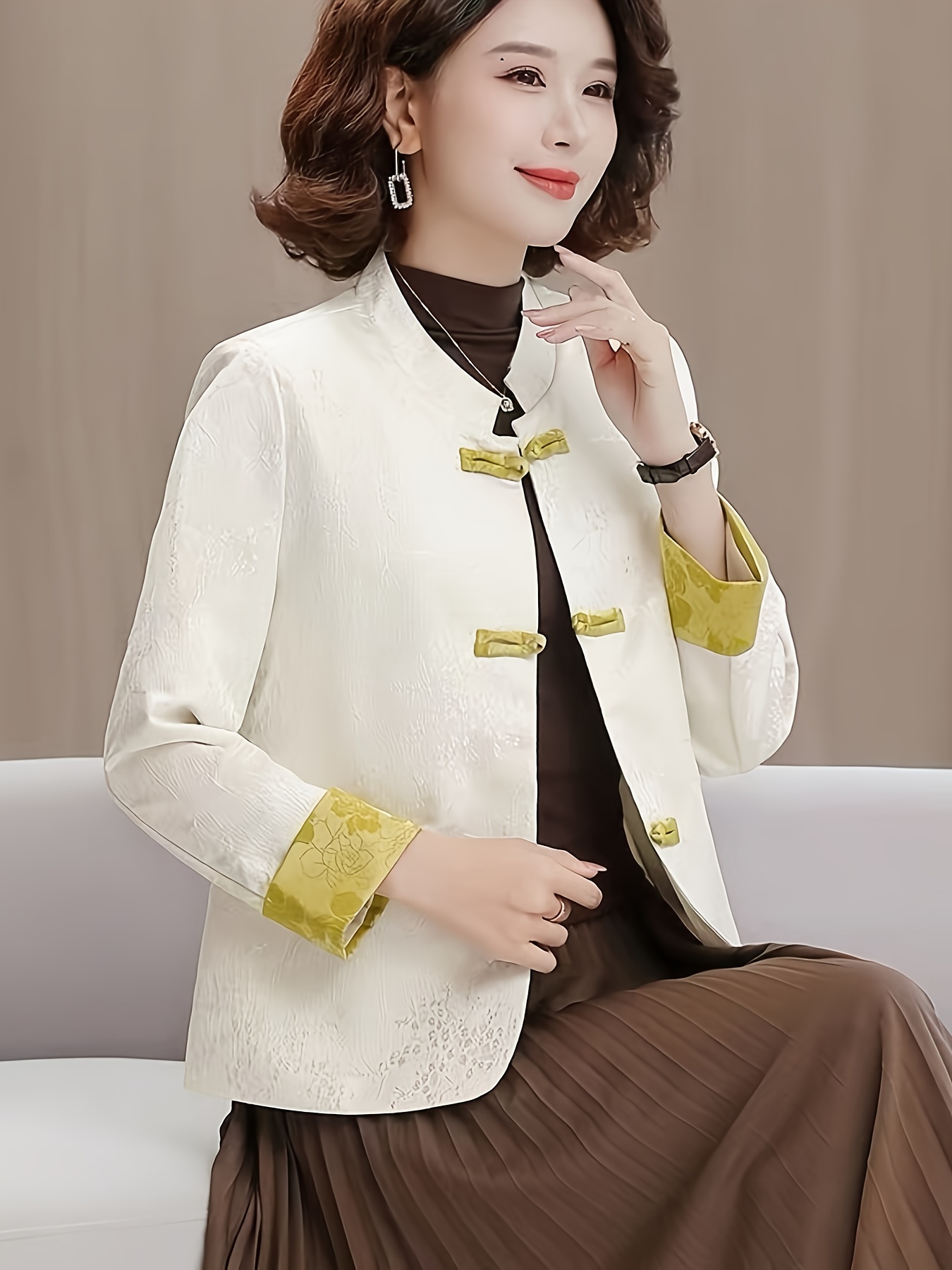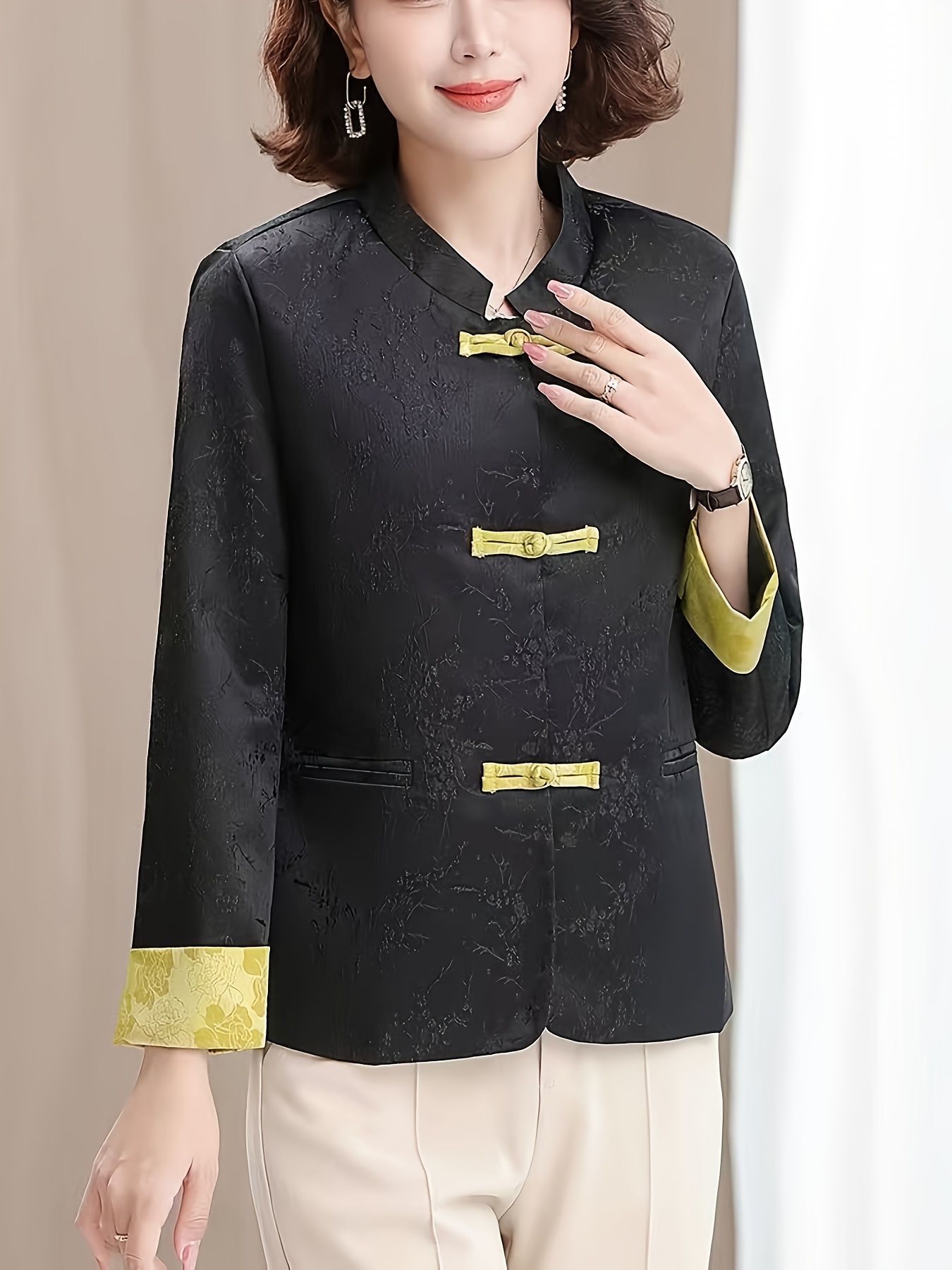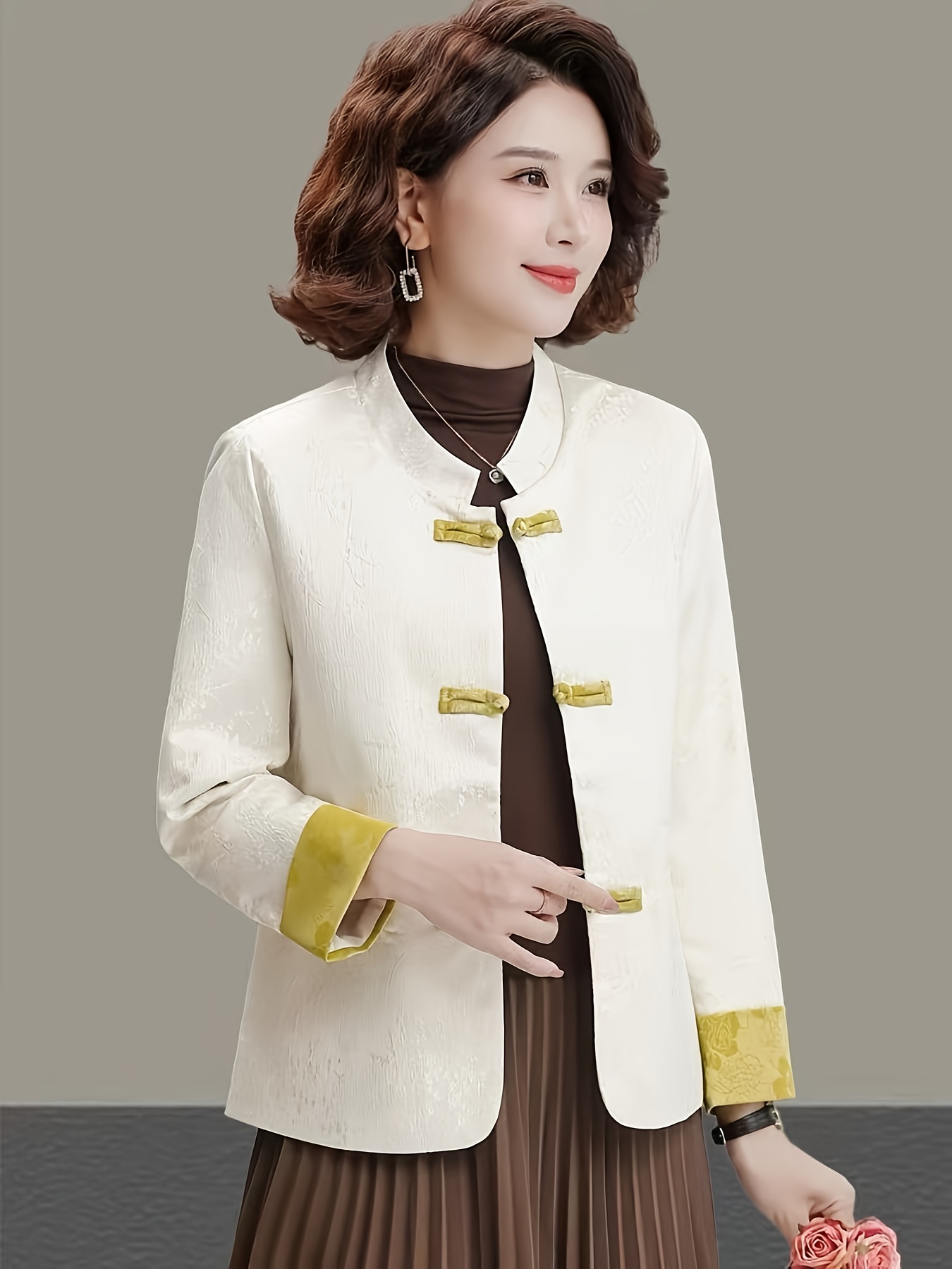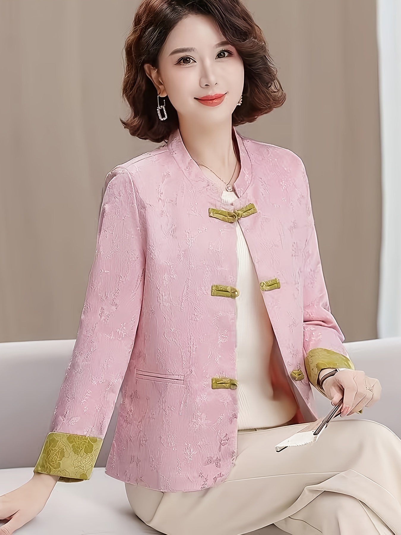 Plus Size - Plus Size, Women'S Chinese Cheongsam Coat - Elegant Vintage Tang Suit Jacket with Pastel pink & Golden Floral pattern, Non-Stretch Fabric, Button Front Closure, Traditional Cultural Formal & Everyday Chic Outerwear for Chinese New Year, Weddings, Cultural Events - Ready-to-Wear Women'S Clothing, Wedding Attire, Nontransparent Material, Festive Wear, Durable Construction, Plus Size Women