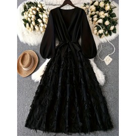 Plus Size - Plus Size, Women'S Elegant Plus Size Black Floral A-Line Maxi Dress with V-Neck & Long Sleeves - Structured Formal to Semi-Formal Evening Gown, All-season Non-stretch Fabric For Weddings, Parties, Casual Attire - Sophisticate