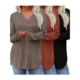 Plus Size, 3pcs Women's Oversized Sweater Set - All-Season V-Neck Sweaters in Beige/, Grey & Dark Brown - Loose-Fit Tunic Tops (Casual to Formal) - Machine Washable Cozy Knitwear for Fall Winter Layering