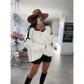 Plus Size - Women'S Casual Long Sleeve Pullover Sweater with Contrast Trim - Loose Fit, Round Neck, Medium Stretch, Striped Pattern, All-Season Comfort, Casual Wear|Striped Sweater|Medium Stretch Fabric