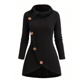 Plus Size, Plus Size Women's High Neck Asymmetrical Button-Front Long Sleeve Top - Stretch Fabric, Machine Washable, Solid Black Casual Chic Fall Winter Tops, Seasonal Wardrobe Staple, Stylish Knitwear, Quality Stitching, Button Front Blouse, Stylish Wardrobe Essential