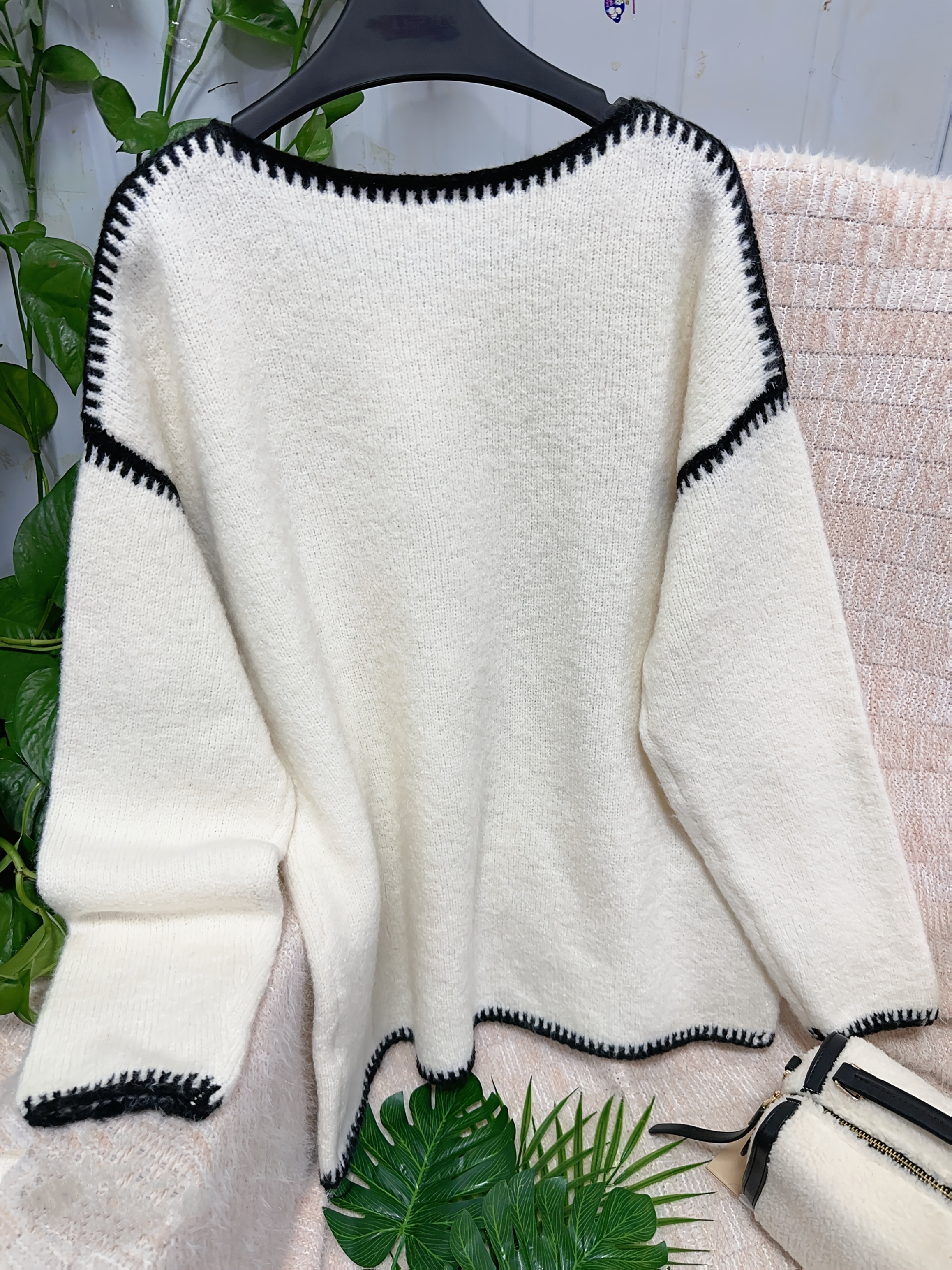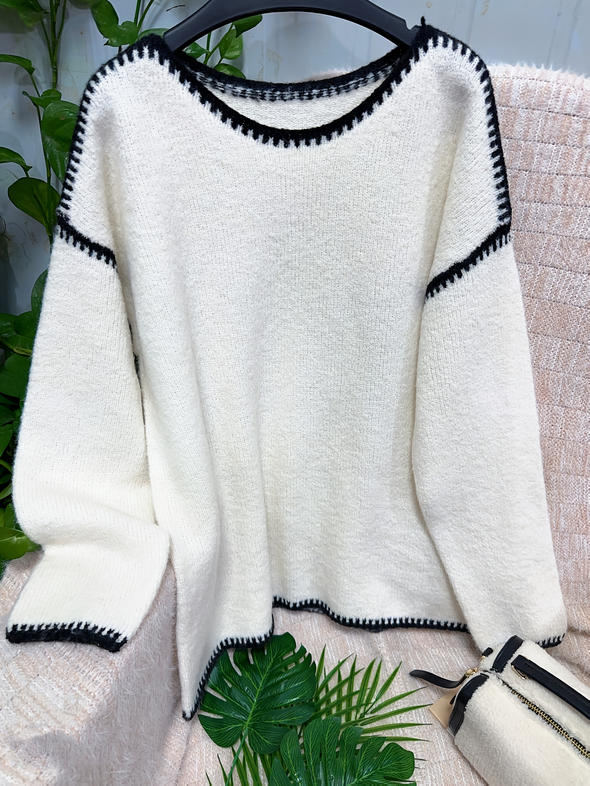 Plus Size - Women'S Casual Long Sleeve Pullover Sweater with Contrast Trim - Loose Fit, Round Neck, Medium Stretch, Striped Pattern, All-Season Comfort, Casual Wear|Striped Sweater|Medium Stretch Fabric