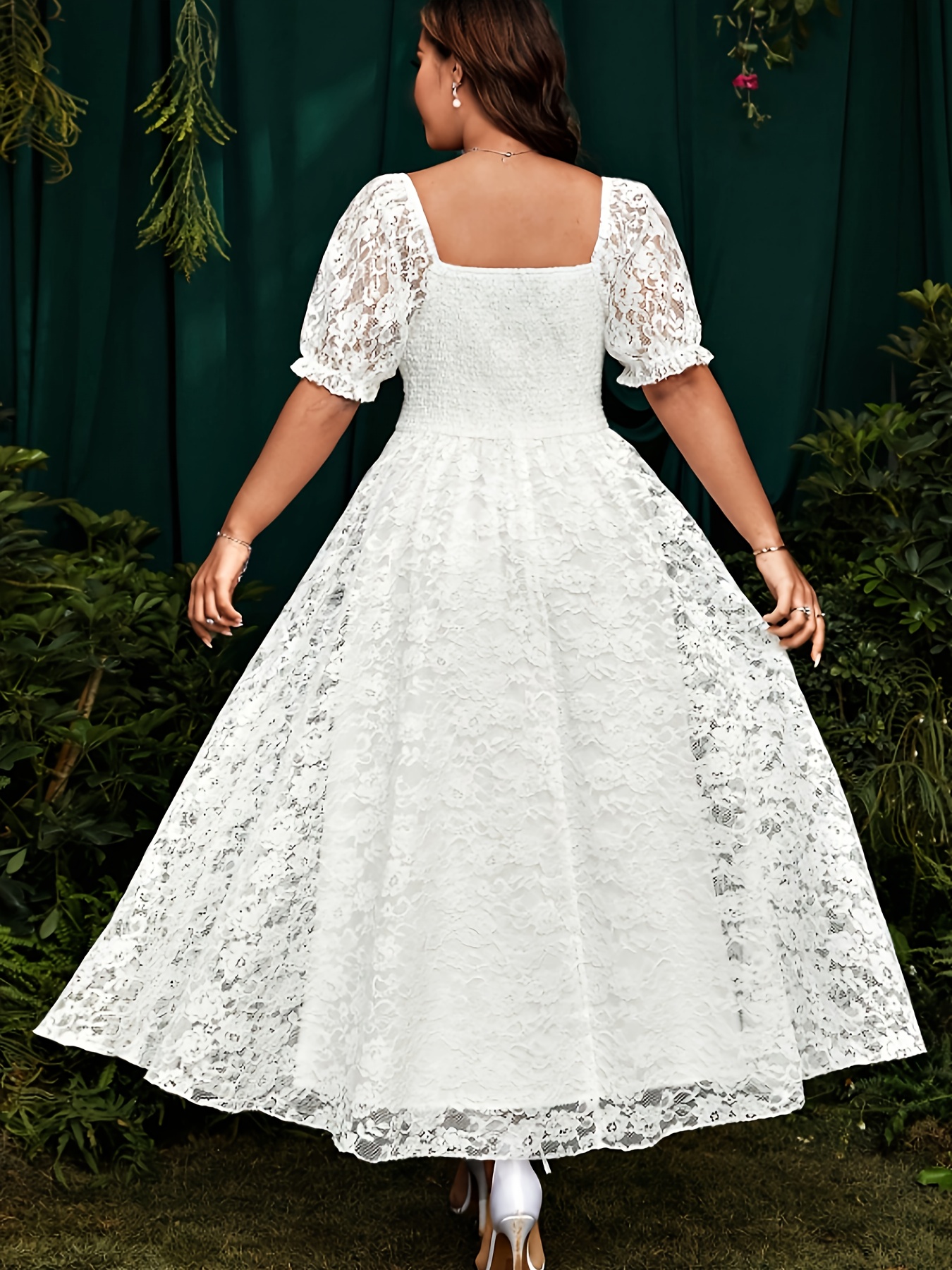 [Pink Lace Dress] Elegant Pink Lace-Trimmed Square Neck Dress for Women | Fitted Shirred Waist, Long Sleeve, Flowing Design - Perfect for Weddings & Formal Events