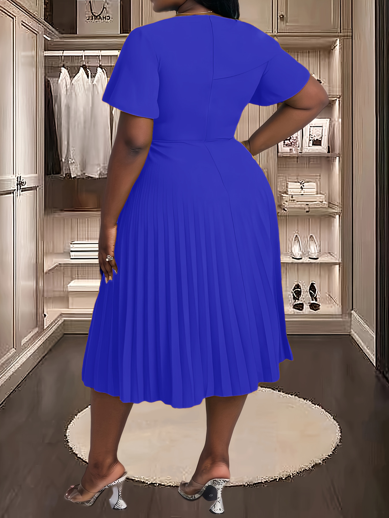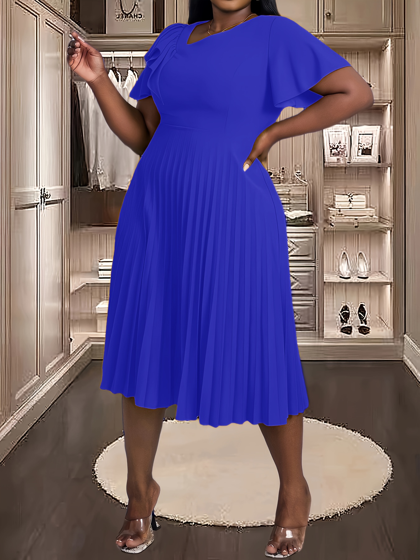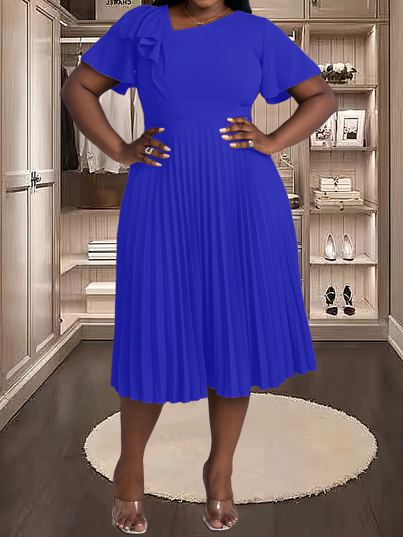 [Royal Blue Midi Dress] Stretchy Polyester Blend Royal Blue Midi Dress | Elegant Pleated with Ruffle Sleeves & Asymmetrical Neckline - Perfect for Summer Parties & Casual Outfits