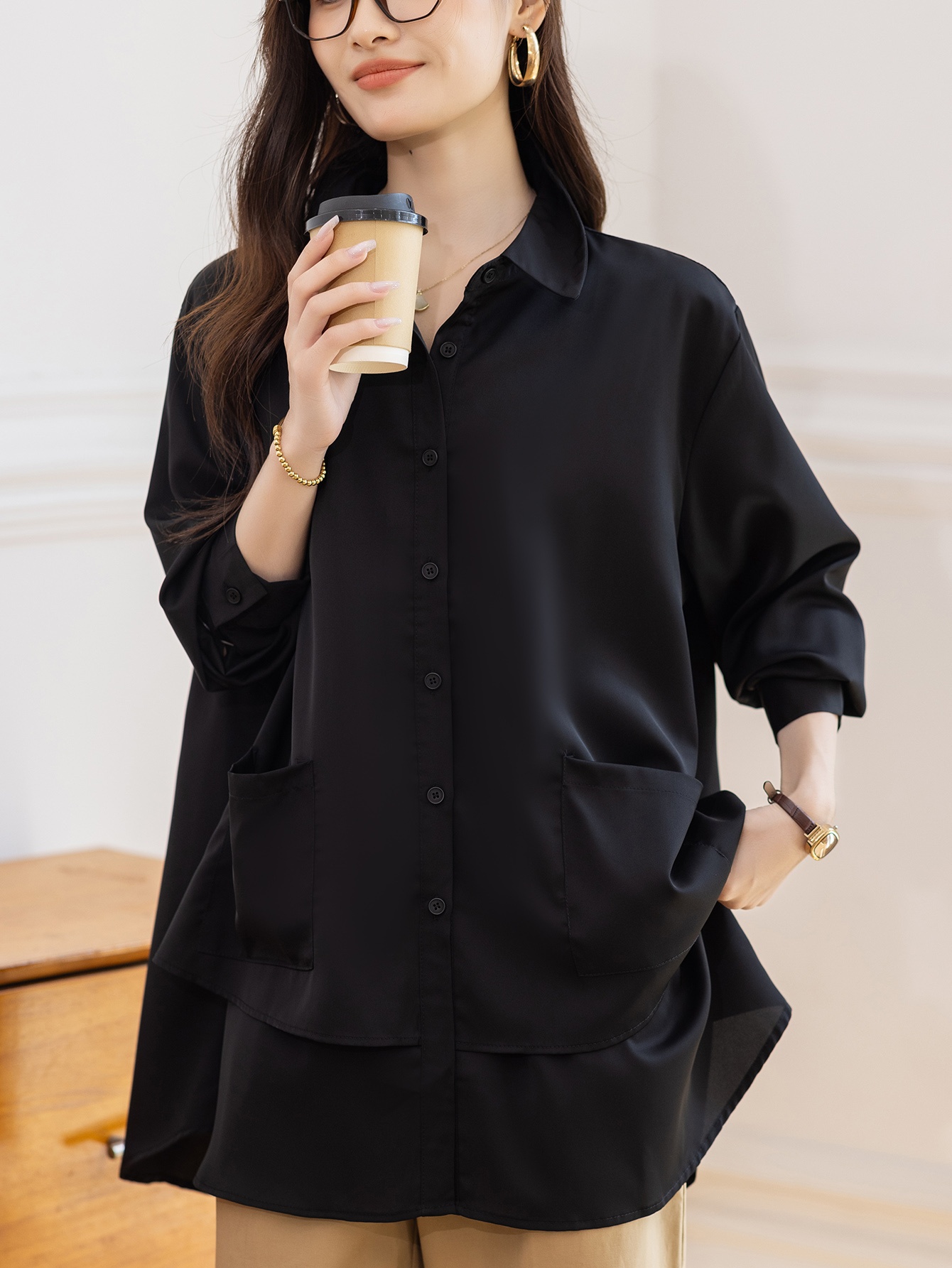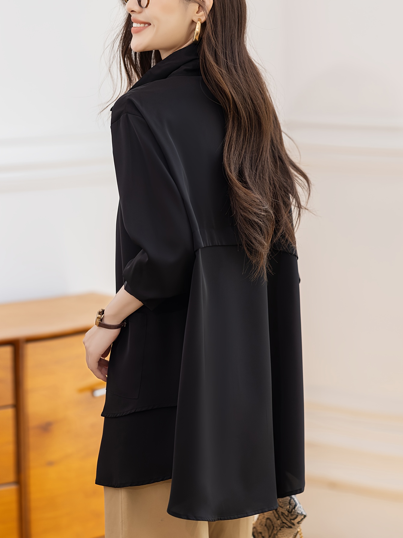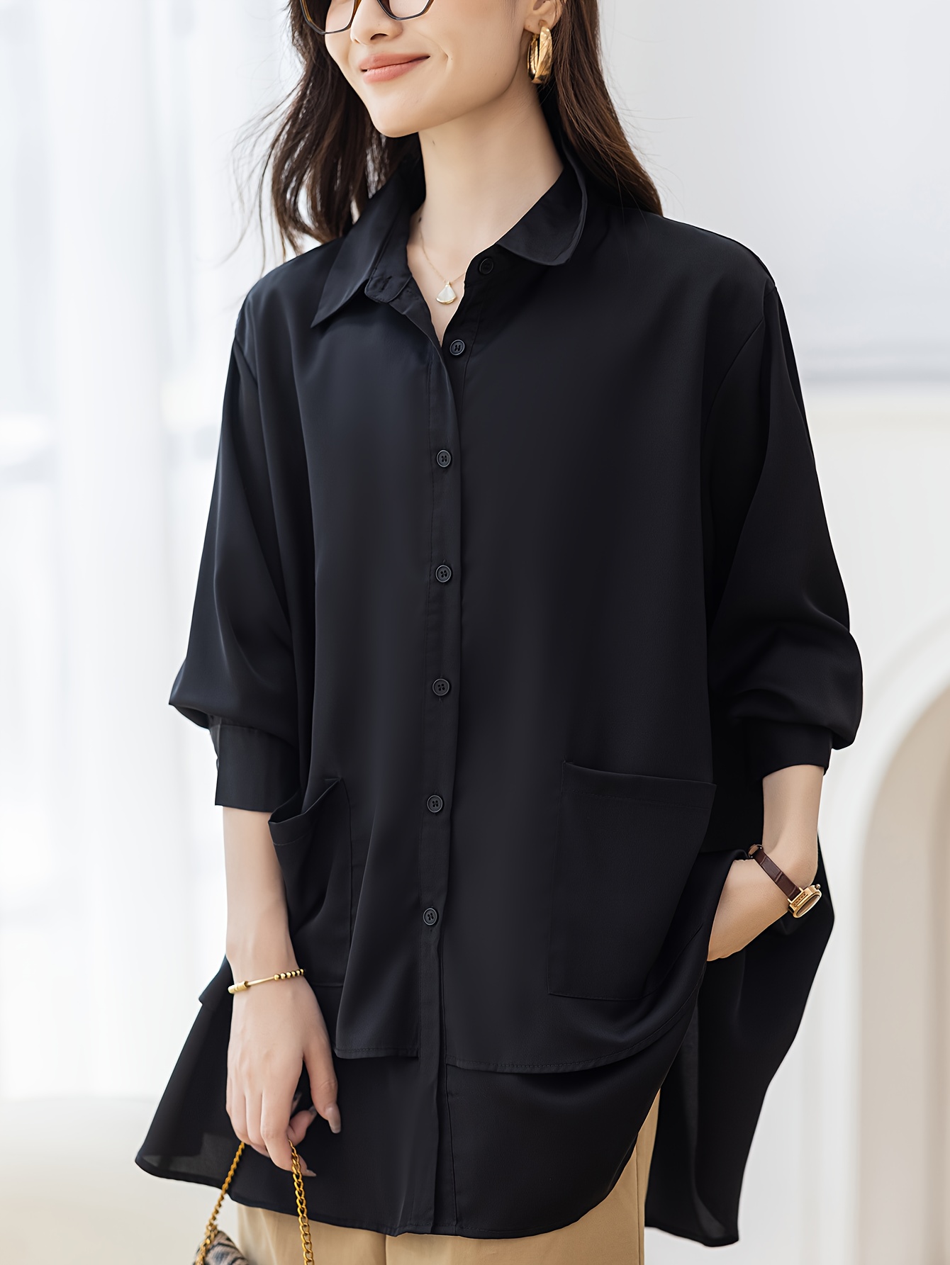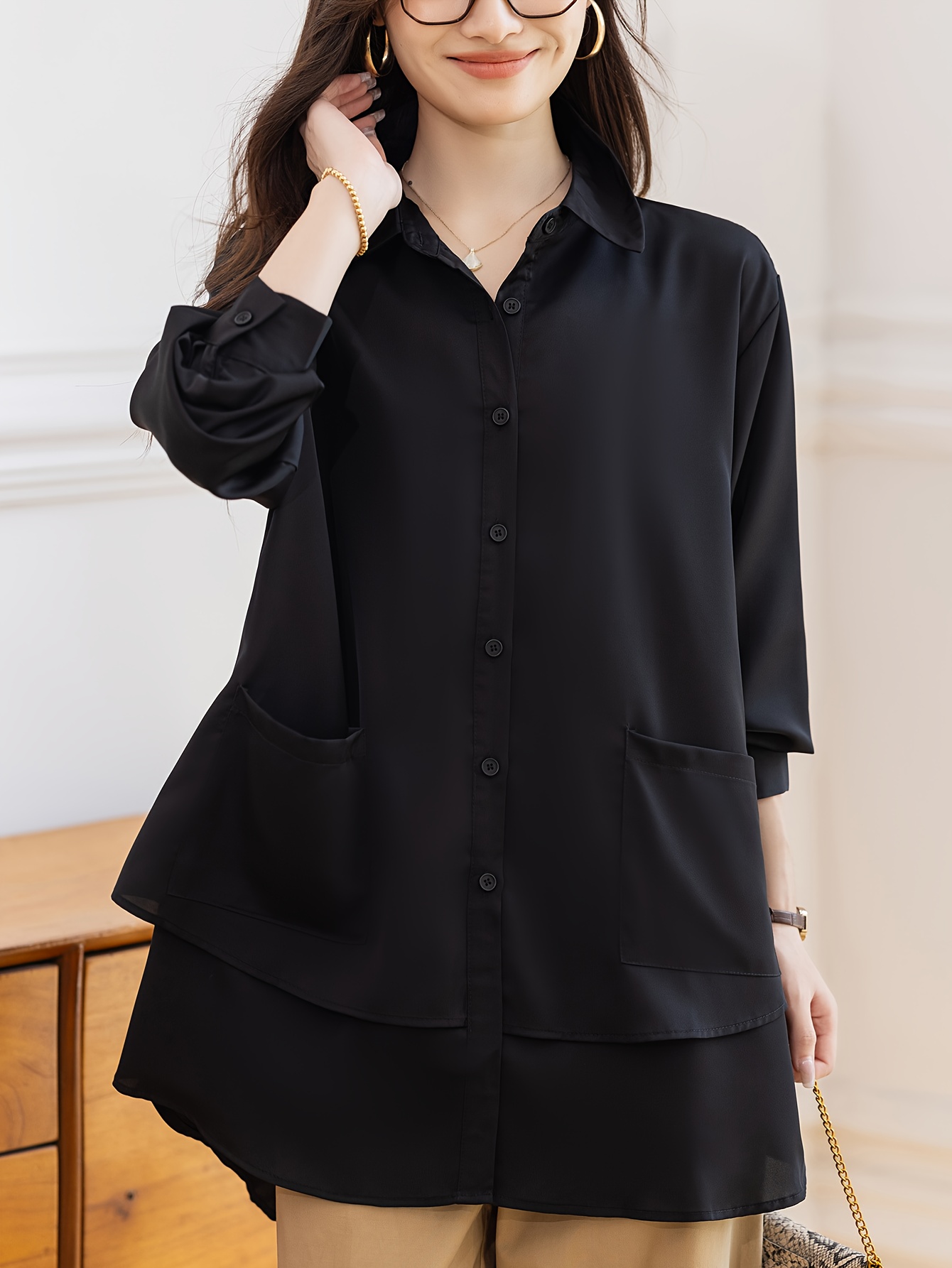 Plus Size, BOHC Women's Oversized Tunic Shirt - Longline Collar Blouse with Button Front Closure, Solid Black Floor-Length or Above-Knee Length Options, Structured Fit for Spring/Fall Casual & Formal Wear, Minimalist Elegant Blouse for Women (Hand Wash/Dry Clean) - New Relaxed Fit Tunic with Button-Up Front, Smooth Texture & Solid Color Design, Suitable for Layering or Standalone Wear, Clothes for Women, Plus Size Lace Blouse, Blouses for Women High Quality,