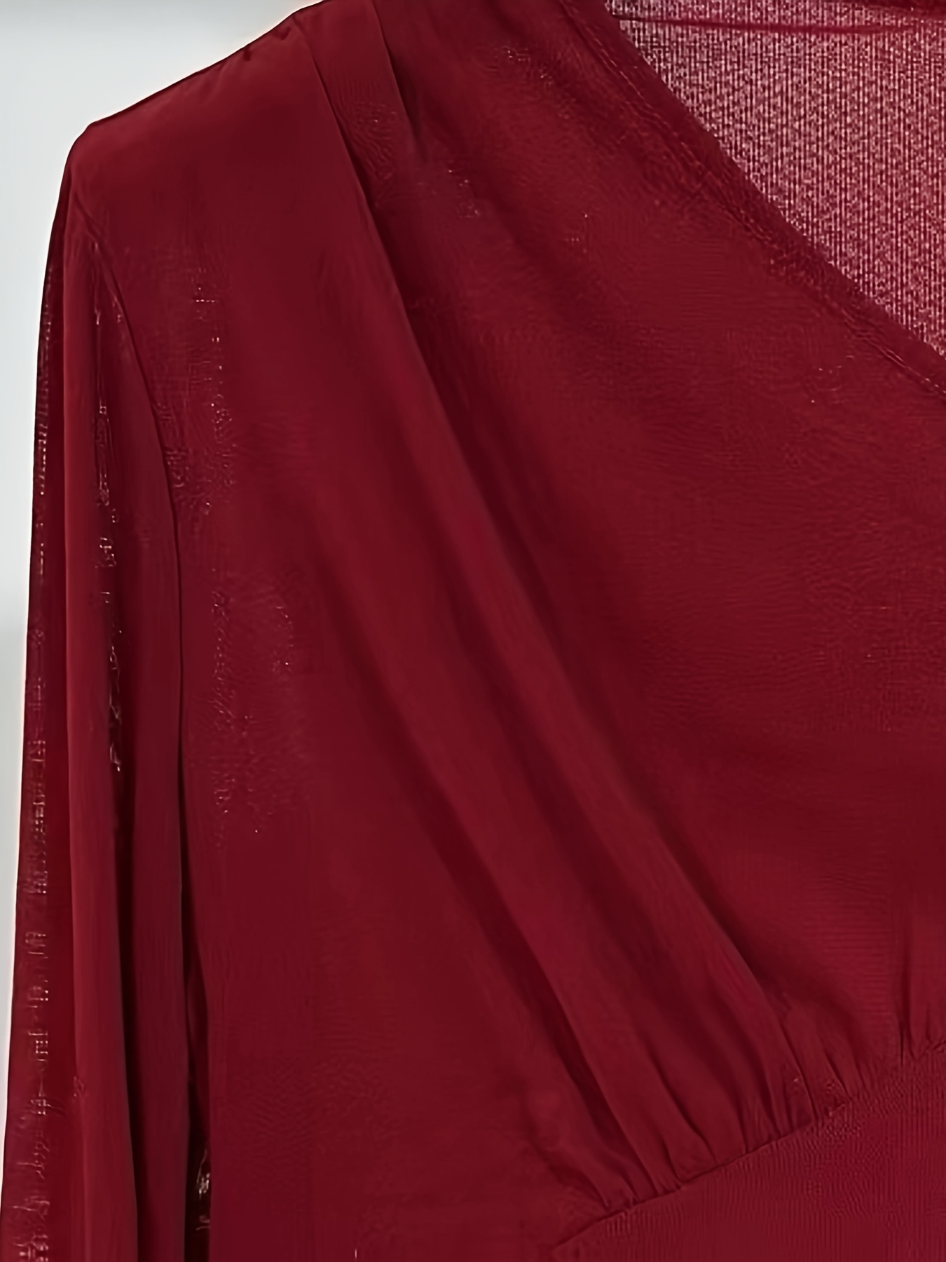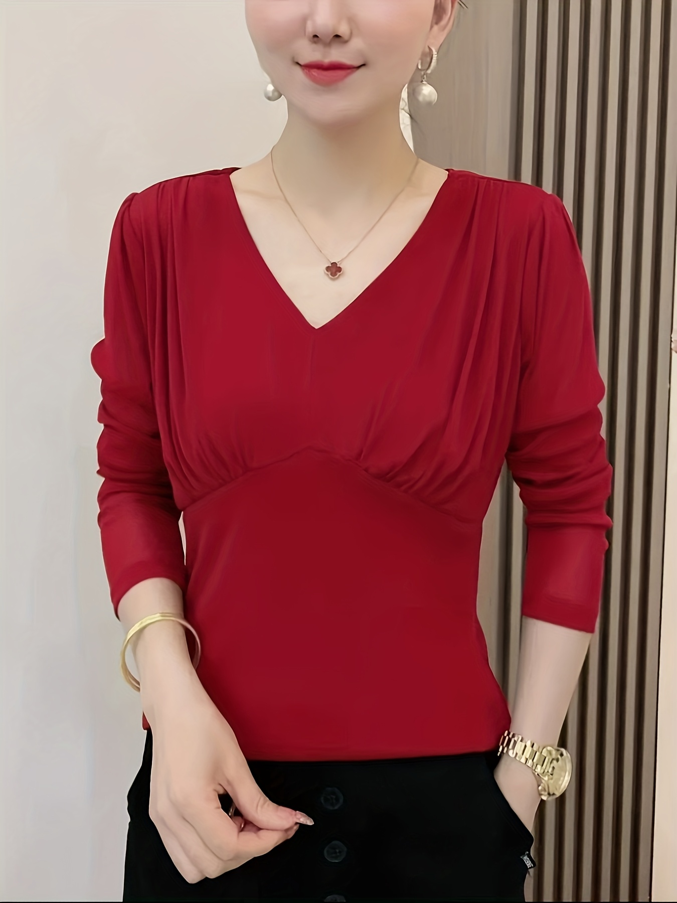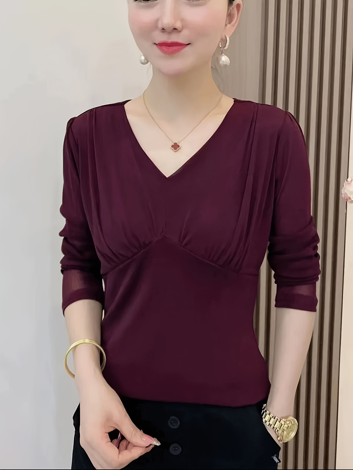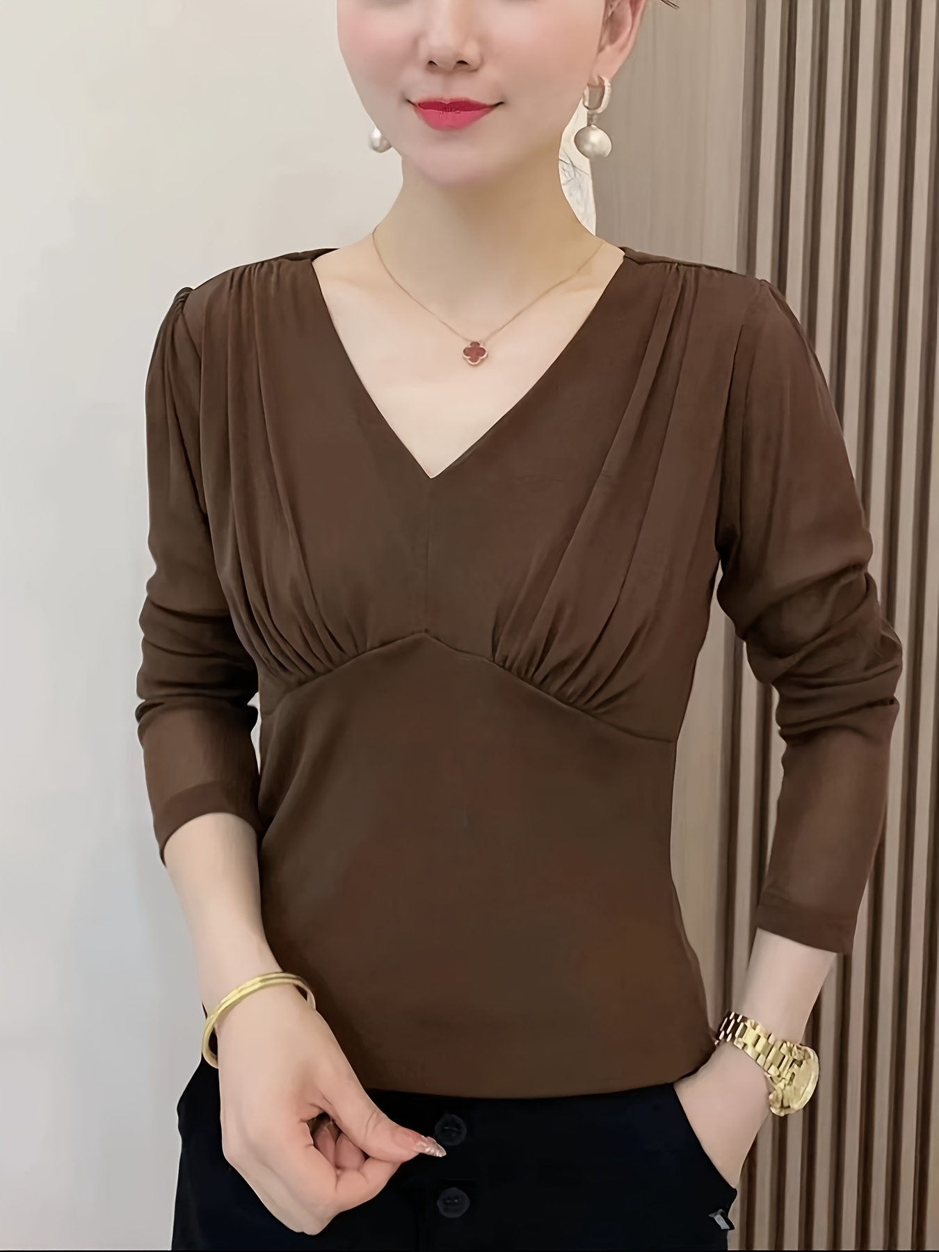 Plus Size - Elegant V-Neck Blouse with Ruched Detail - Long Sleeve, Solid Brown, Medium Stretch Fabric, Perfect for Evening Outfits, Ladies Blouses