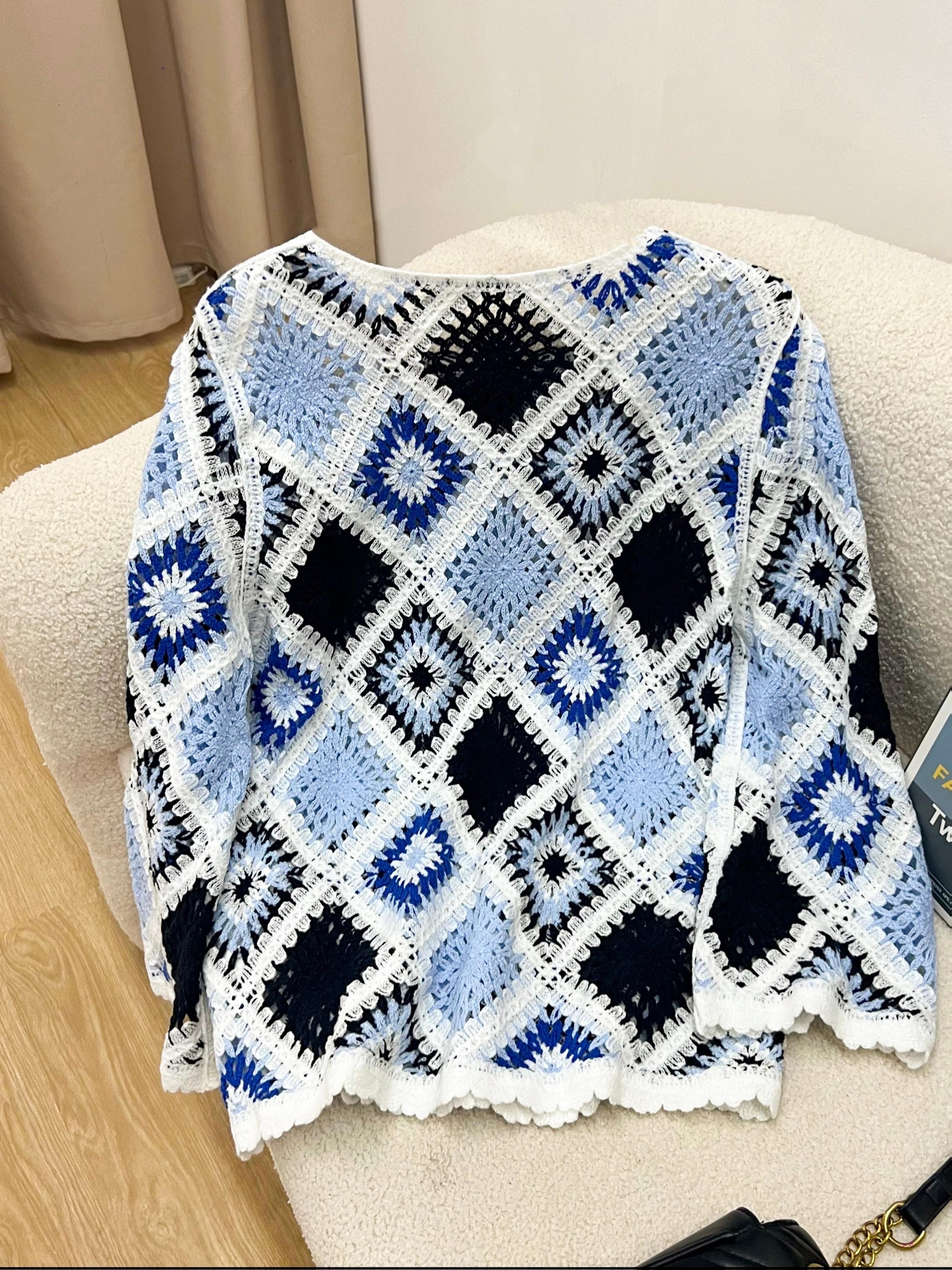 Plus Size - Women'S Bohemian Style Crochet Top - Lightweight Hollow Round Neck Sweater with Blue & Black Color Block Design, Long Sleeve Pullover for Fall/Winter