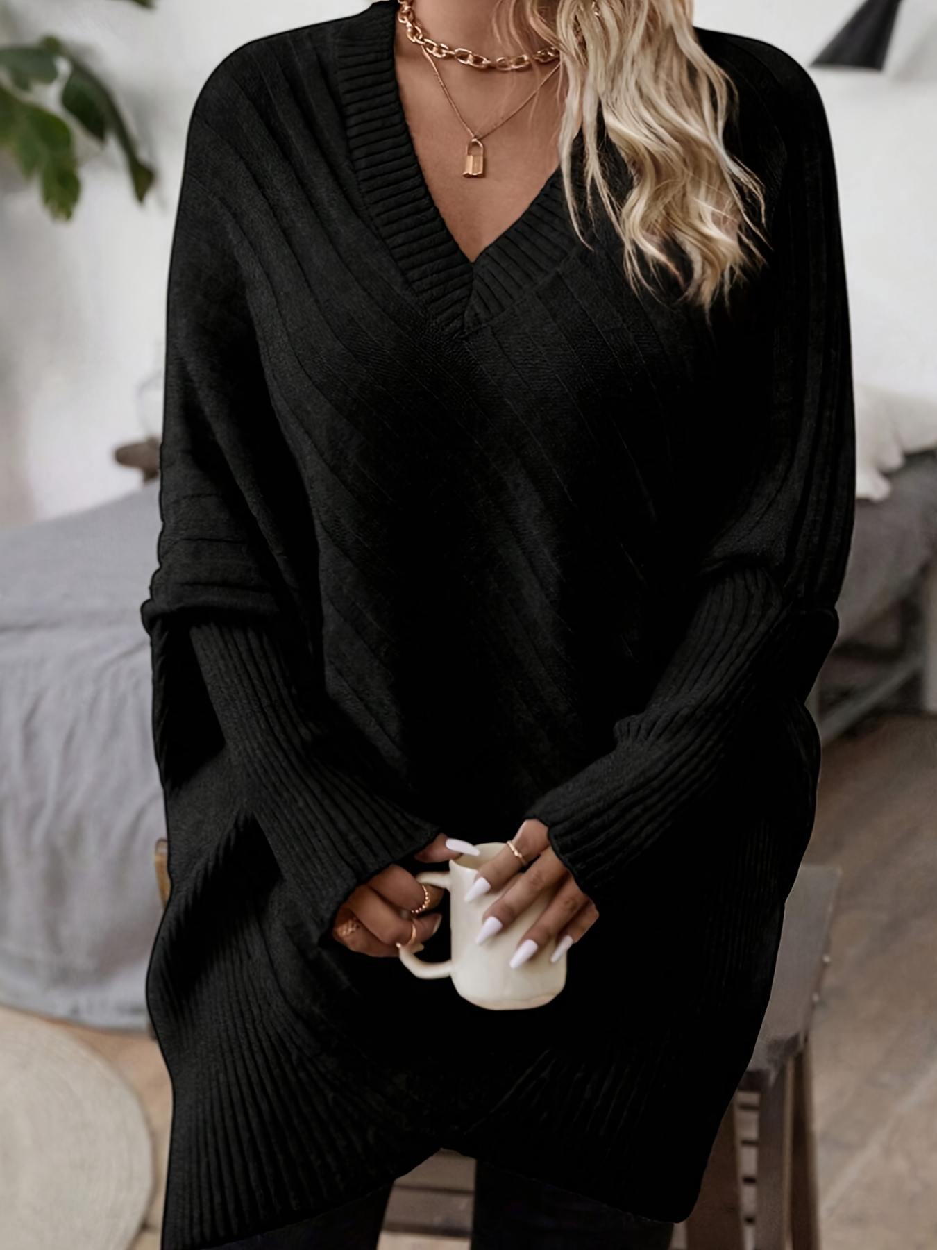 Women's Elegant V-Neck Batwing Sleeve Sweater, Soft Stretchy Long Sleeve Pullover Loose Fit, All-Season Layering Top for Casual & Formal Outfits, Versatile Clothing Comfortable Wear, Office Attire Stylish Knitwear, Plus Size