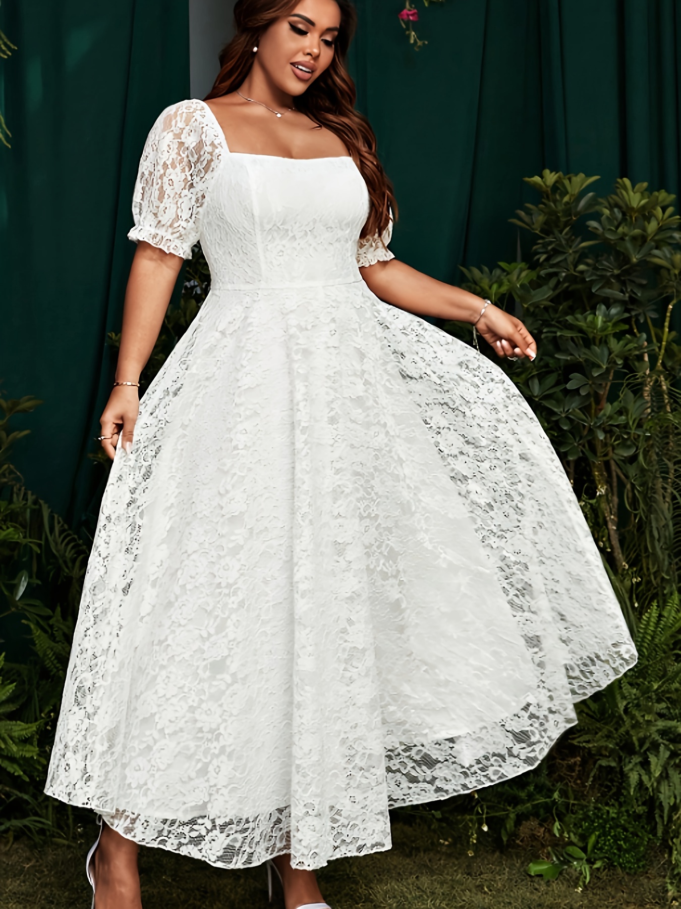 [Pink Lace Dress] Elegant Pink Lace-Trimmed Square Neck Dress for Women | Fitted Shirred Waist, Long Sleeve, Flowing Design - Perfect for Weddings & Formal Events