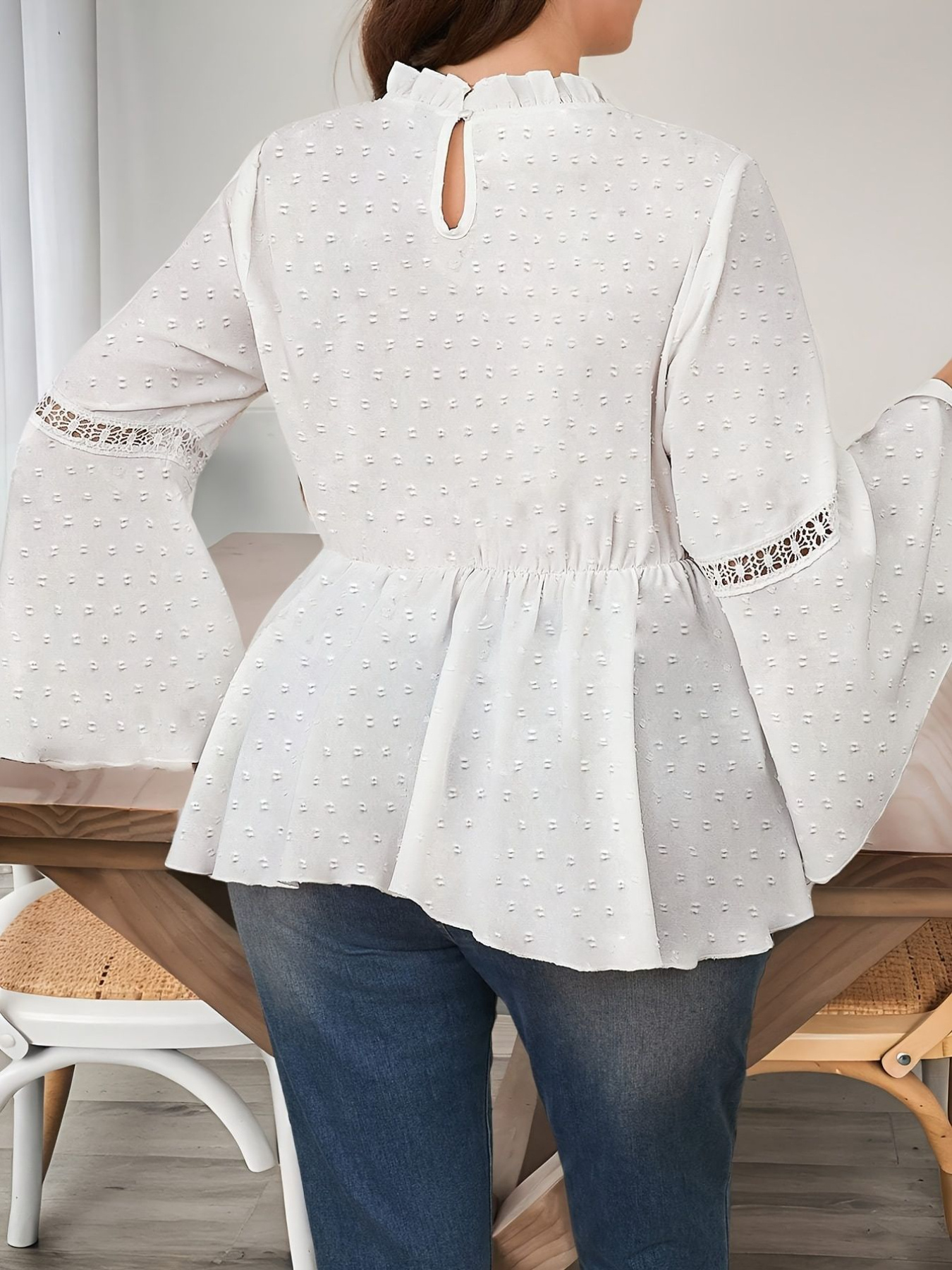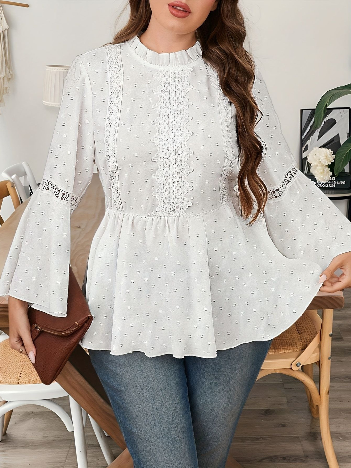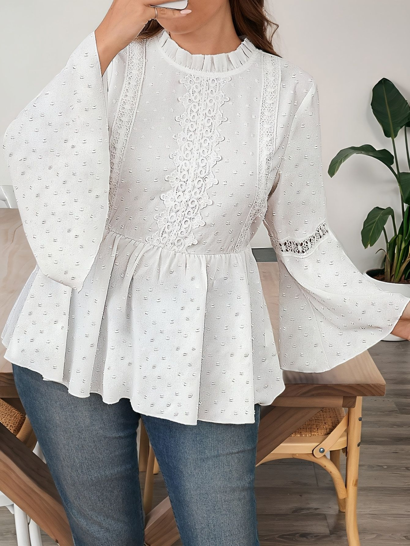 Plus Size - Women'S Elegant Solid Color Lace Trim Ruffle Sleeve Blouse - Plus Size Long Sleeve Round Neck Casual to Semi-Formal Shirt, Breathable Non-Stretch Fabric with Flared Bell Sleeves, Spring/Autumn Versatile Top for Everyday & Special Occasions, Easy-Care Durable Design, Spring Fashion, Autumn Outfit, Delicate Detailing, Lightweight Material, Stylish Shirt, Fashion Lovers, Office Wearers, Beautiful Blouse For Plus Size Women, Plus Size Women Clothes, Blouse Women