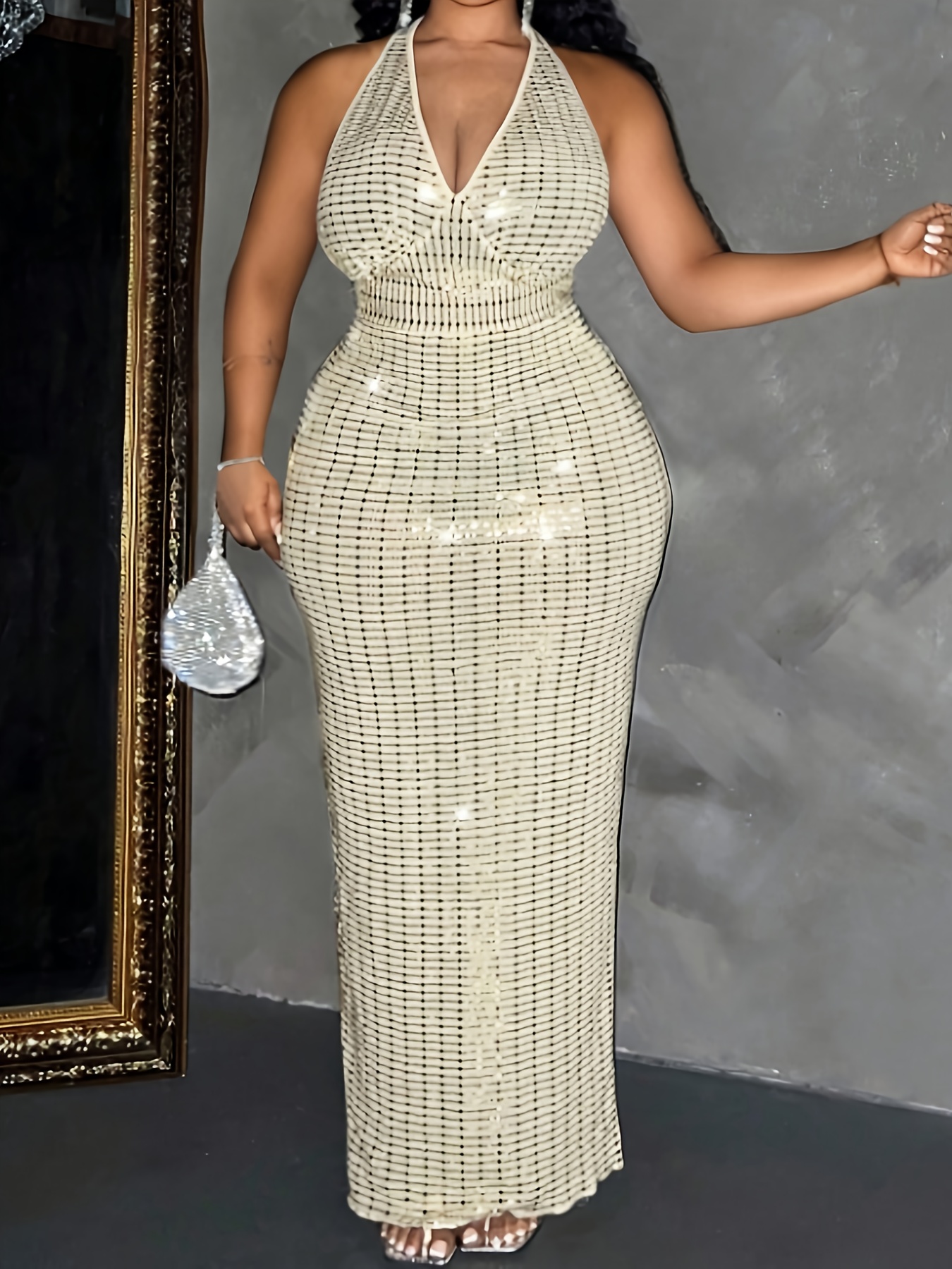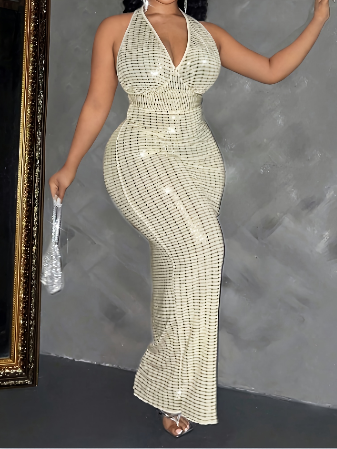 Plus Size Women's Sleeveless Halter Neck Sequin Dress - Elegant Bodycon Summer Party Dress with High Slit, Hand Wash Only, Formal Occasion Attire | Stretchy Fabric Gown
