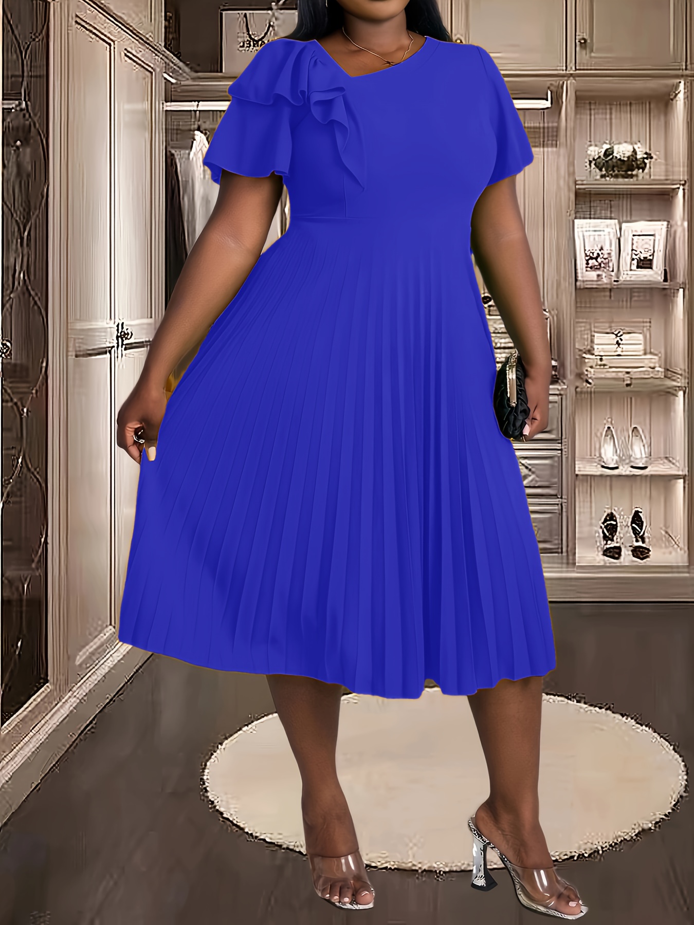 [Royal Blue Midi Dress] Stretchy Polyester Blend Royal Blue Midi Dress | Elegant Pleated with Ruffle Sleeves & Asymmetrical Neckline - Perfect for Summer Parties & Casual Outfits